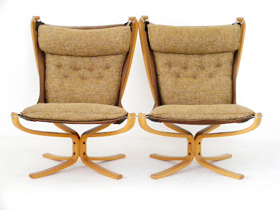 A fabulous pair of original Falcon Chairs. Designed by Siggurd Resell in Norway in 1974 for Vatne Møbler. A moulded wood frame and original upholstery, worn in some places and missing a short leather strap on one. All can very easily be fixed with a new upholstery job. Both chairs bear the original manufacturers mark. These chairs are super, super comfortable!