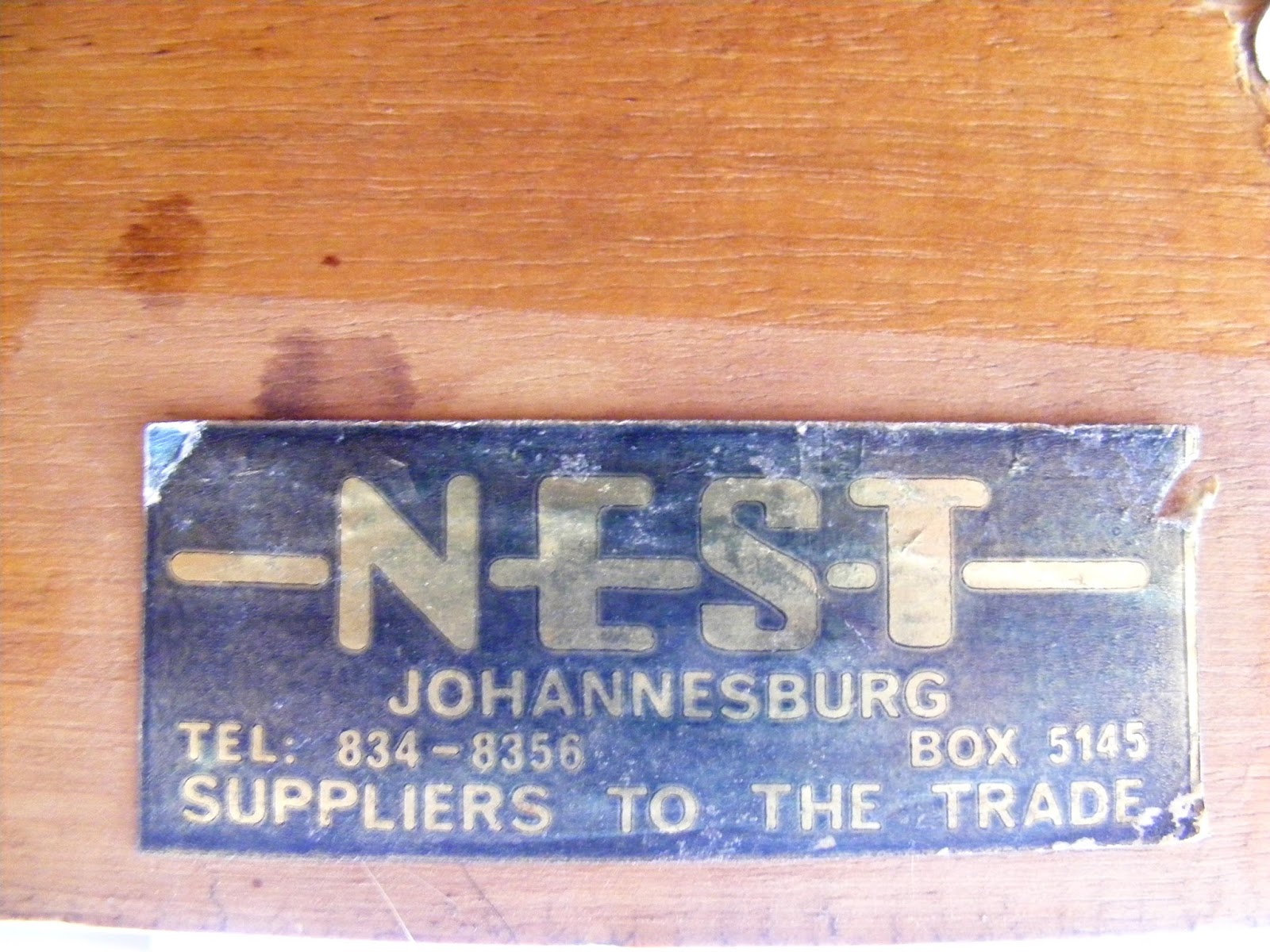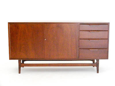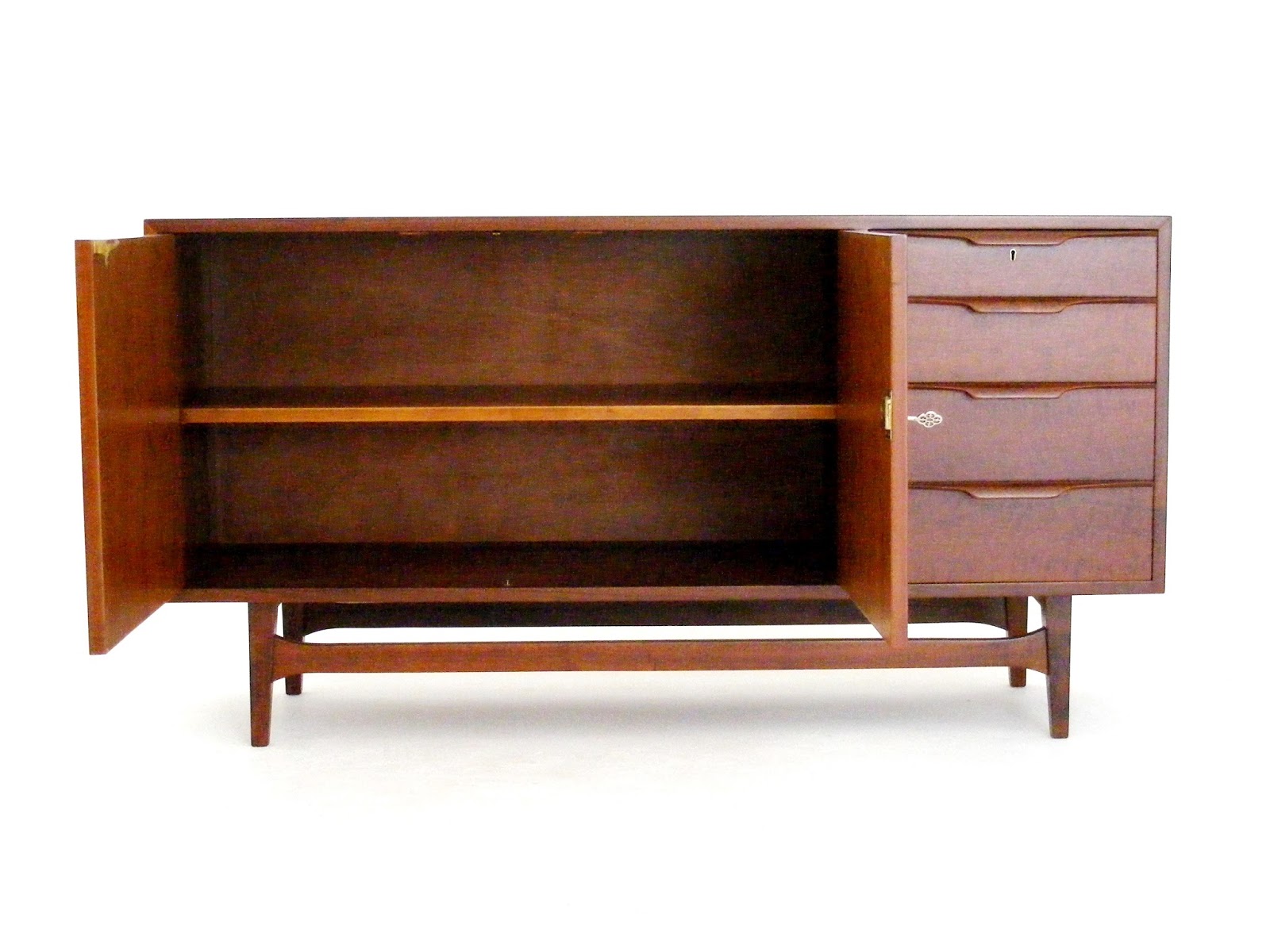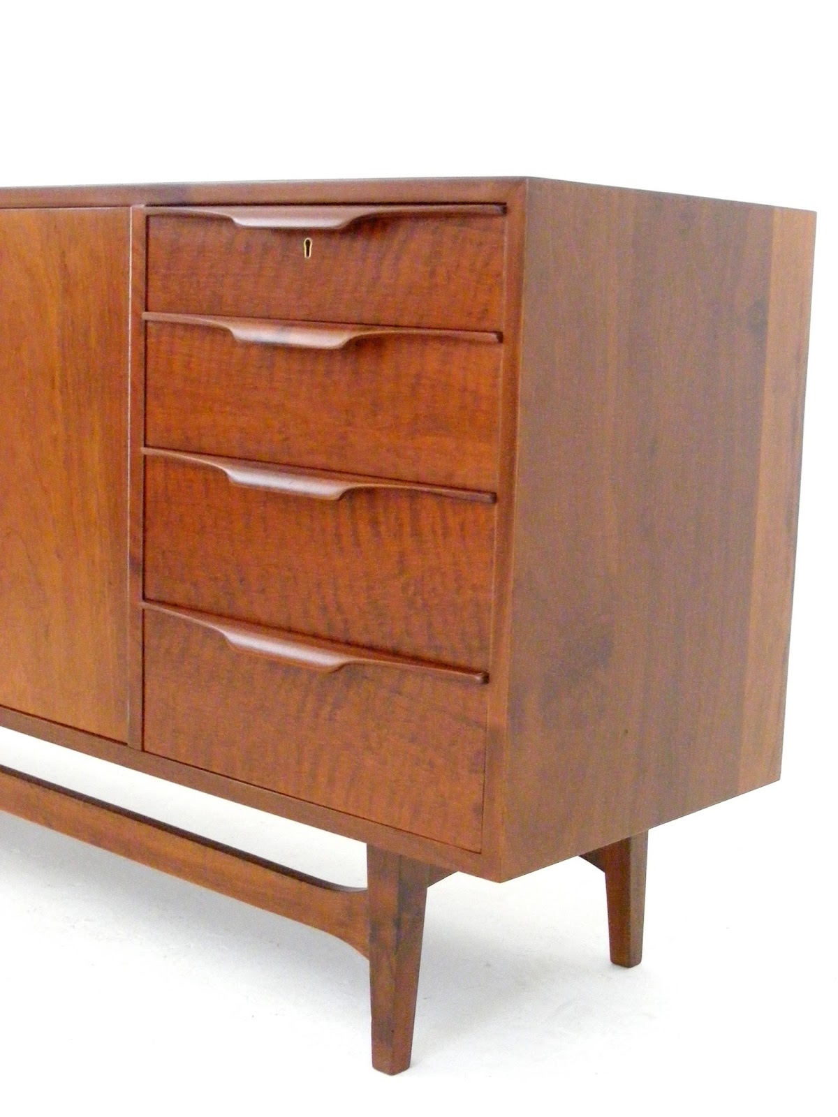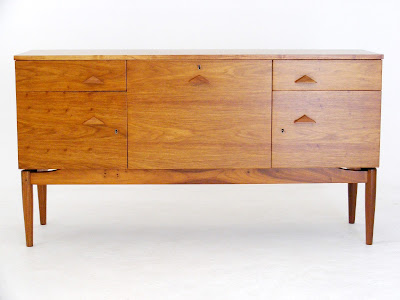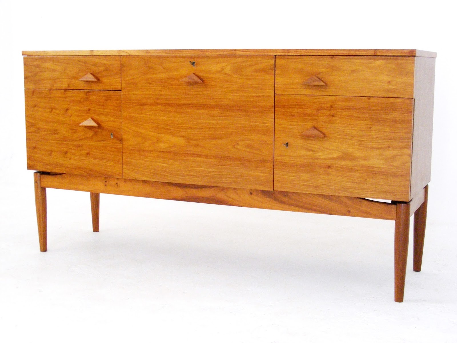 A mid-century Kiaat sideboard with triangular handles bearing the manufacturers mark: Nest, Johannesburg. (South Africa)