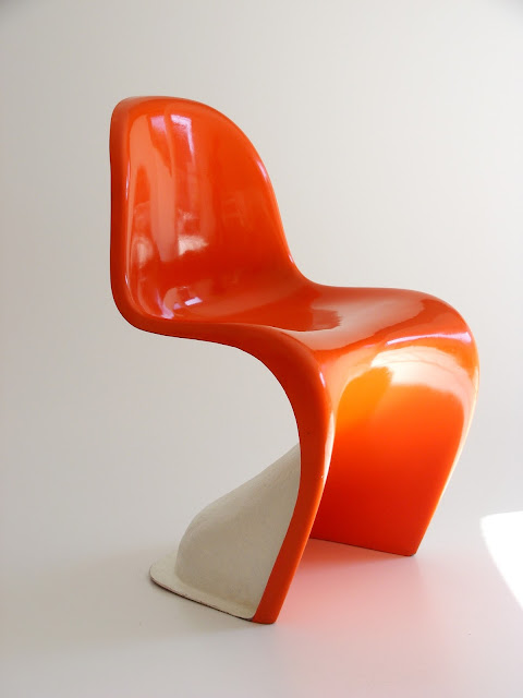 An orange vintage fibreglass chair in the style of a Panton chair. It looks like it was repainted in this colour some years back, but we love it so much that we have left it as we bought it.